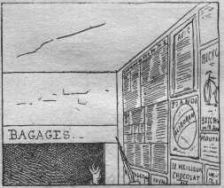 Nous disions donc Bruxelles... ah, voilà !...Non ! c'est gonesse... ah! J'y suis...le premier train est à... Il était écrit que M.Fenouillard ne devait pas connaitre l'heure du premier train pour Bruxelles, car le voila qui s'écroule en poussant un hurlement de désespoir.