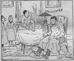 Le soir, madame Fenouillard ayant fini d'avaler son fromage, put enfin émettre quelques sons et déclare à son époux que dorénevant elle ne l'écoutera plus quand, sous pretexte de voyage, il voudra l'arracher à son foyer. Ainsi finit le premier voyage de l'interessante famille.